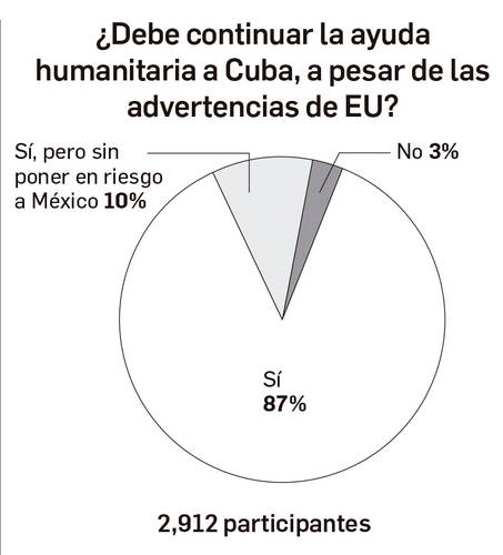 En tu opinión, ¿debe continuar la ayuda humanitaria a Cuba, a pesar de las advertencias de EU de sancionar con aranceles a los países que lo hagan? Es el tema del sondeo de esta semana. Los resultados, en la gráfica.