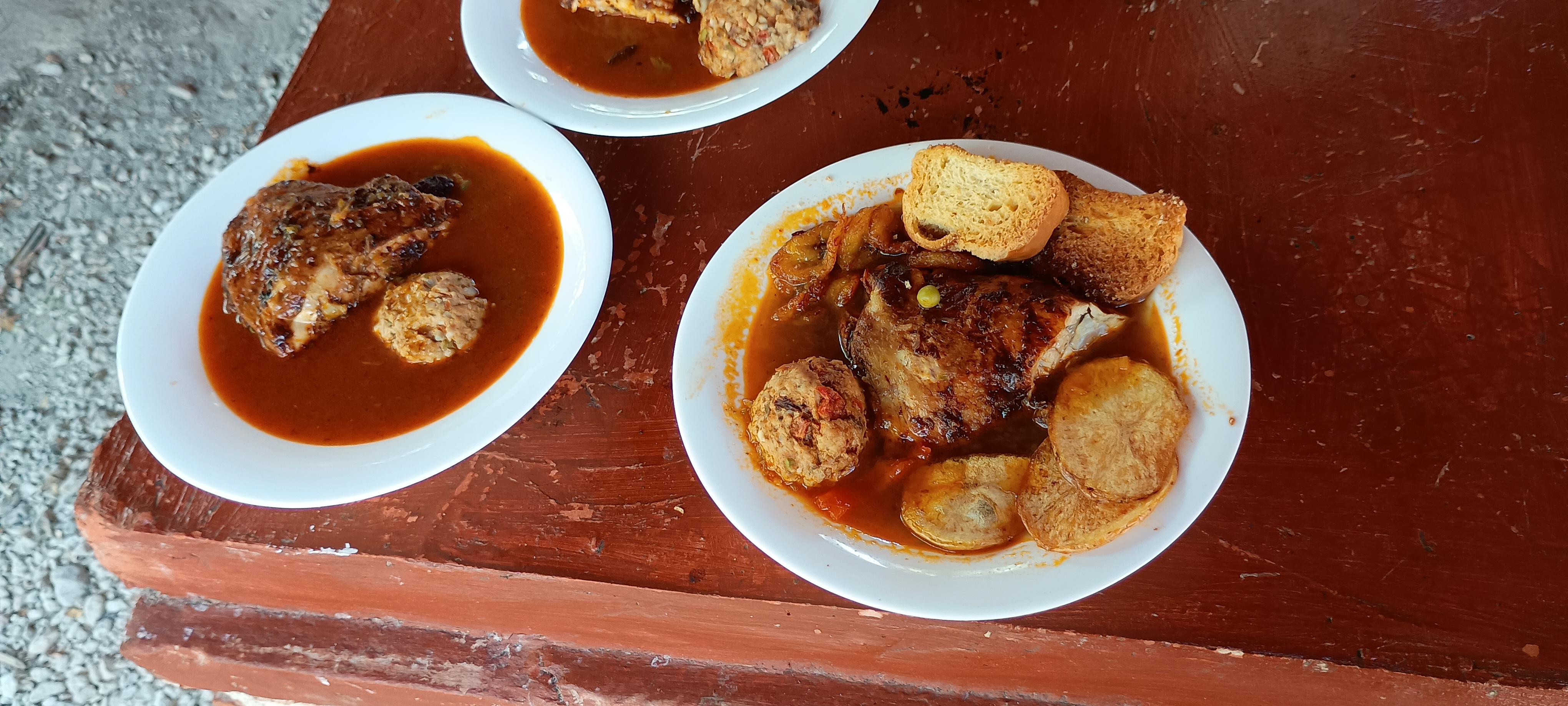 Son pocos minutos para intentar resolver el motivo del nombre: ¿el apóstol de Jesús o el filósofo francés que pretendía “mejorar lo más rápidamente posible la existencia moral y física de la clase más pobre”? Imposible contestarlo sin ver el origen del guiso, que todavía no cumple su primer centenario. Que si llegó de Espita (lo que equivale a trasladar el problema), que si un trabajador cubano que llegó a servir a una familia de Cansahcab, que si fue el cura Agapito Chiclín, quien recibiera la ordenación sacerdotal en La Habana. Estas últimas resultan viables, porque el consenso es que la influencia caribeña es fuerte, con la presencia del plátano frito o tostones, además de la tríada de aceitunas, alcaparras y pasitas, presente en otros platillos yucatecos. Y no, no alcanzamos conclusiones definitivas, salvo una: