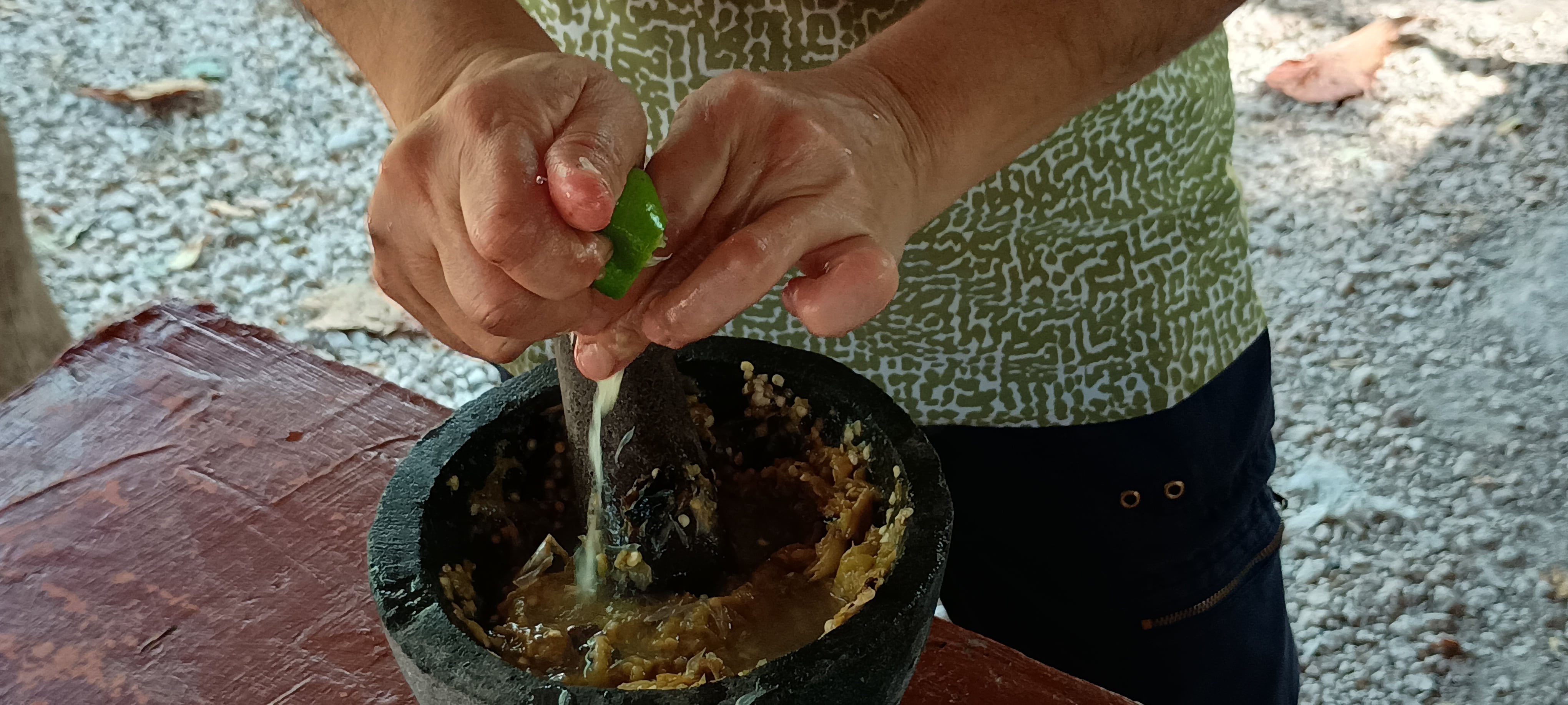 La conversación entre los fuegos reafirma la idea de que hemos sido honrados con la invitación a degustar un platillo gourmet: Sandra no se salta un paso, ni escatima en el cuidado de cada ingrediente. Aunque en lugar de pavo nos ofrece pollo, éste no desmerece ni decepciona al sentido de la vista. A fin de cuentas, el tratamiento es el mismo. De un lado, las presas de las aves previamente sancochadas esperan su turno para entrar a la parrilla; al otro, papas y plátanos macho en rodajas aguardan al aceite de fritura;en el caldo se observan, además de las bolas de “but”, un ensartado de xcatiques previamente pasados por la lumbre y exhibiendo sus argumentos para merecer una denominación de origen; en la parrilla se encuentra el sofrito preparado con manteca de pollo. Por supuesto, es imposible resistirse a probar esta “cascarita” de la piel frita.