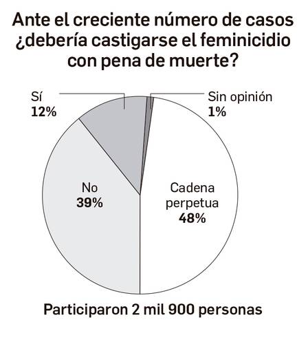Ante el creciente número de casos, ¿debería castigarse el feminicidio con pena de muerte? Hay una iniciativa de ley que impone 70 años de cárcel como condena máxima. Este es el tema del sondeo de esta semana. ¿Tu opinión? Los resultados, en la gráfica.