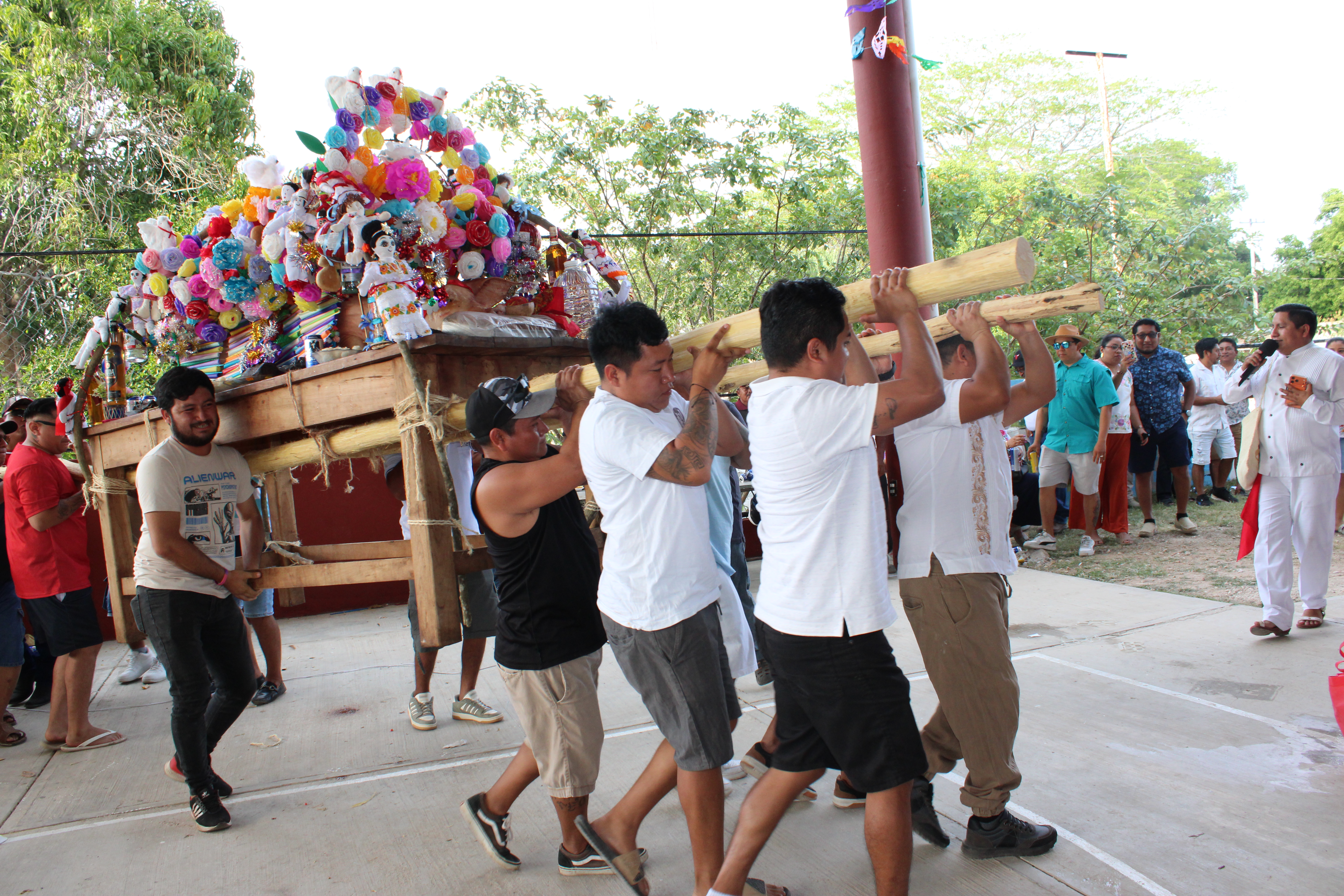 Durante el recorrido la charanga jaranera interpreta la Danza de la Cabeza de Cochino y cuando los cargadores se detienen a descansar el Chi’ik, un personaje que se encarga de alegrar el recorrido, recita los versos de una bomba yucateca y en seguida moja a los asistentes arrojándoles licor de caña, esto se repite hasta llegar al destino final. Llegando a la nueva casa, las ofrendas se dividen entre los socios y si un asistente desea adquirir alguno de los ofrecimientos, debe comprometerse a devolver el equivalente el año que sigue.