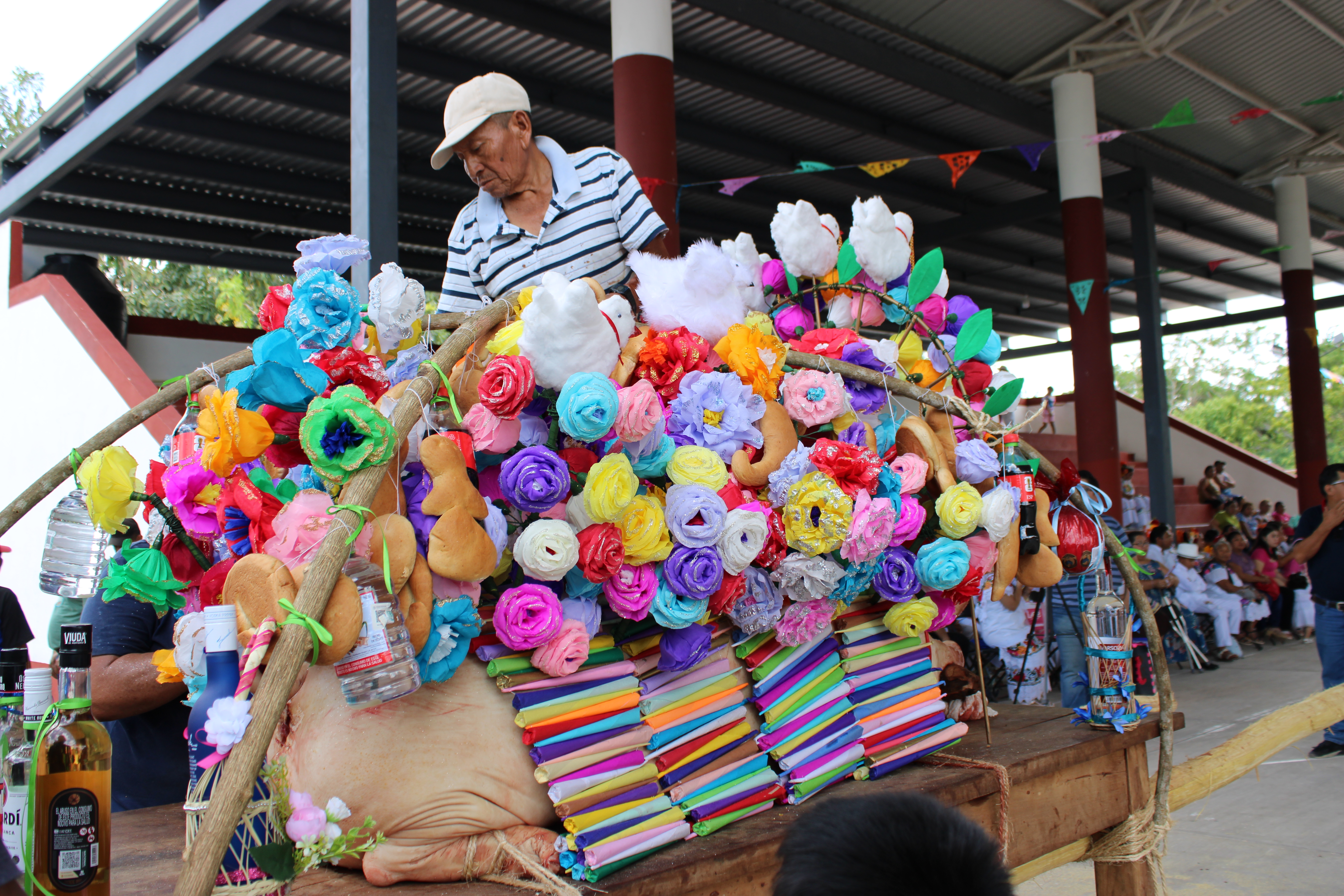 La mesa con el cerdo crudo es cargada en hombros por 18 hombres para trasladarla a la cancha junto a la capilla del pueblo. Ahí, las mujeres se encargan de adornar a Tonich con buqués de flores de papel, figuras de palomas (representación de pureza y del Espíritu Santo), muñecas de trapo (walnook’/balasche’) como exvotos, pan de agua (xtuch’itos) en forma de muñecos y sonajas, bolas de queso holandés, botellas de diferente aguardientes, cigarros artesanales (chamal), platos de dulces melados de ciruela y papaya, dulce de arroz con canela y en su frente van escondidas dentro de una tela roja tres monedas antiguas de plata que recuerdan las relaciones comerciales dentro de la hacienda. En su hocico se coloca una pieza grande de pan batido con el nombre San Bernardo escrito en él.