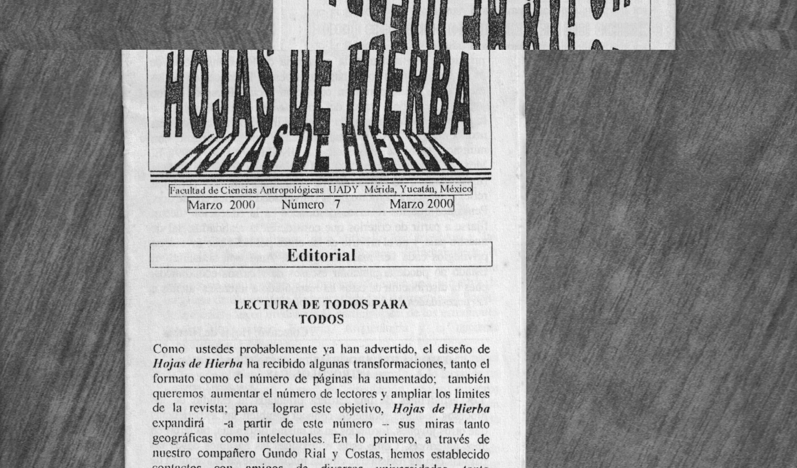 Durante el segundo semestre de 1999, Arturo Guillermo Oseguera Huanosto dio impulso a un proyecto editorial en la Facultad de Ciencias Antropológicas de la Universidad Autónoma de Yucatán. Estudiante de Lingüística y Literatura, invitó a los alumnos de las demás especialidades a colaborar en una revista creada bajo su responsabilidad exclusiva, a la que denominó Hojas de Hierba. Su convocatoria tuvo una respuesta favorable, sobre todo de parte de aquellos que querían ver publicados sus poemas y otros escritos breves.