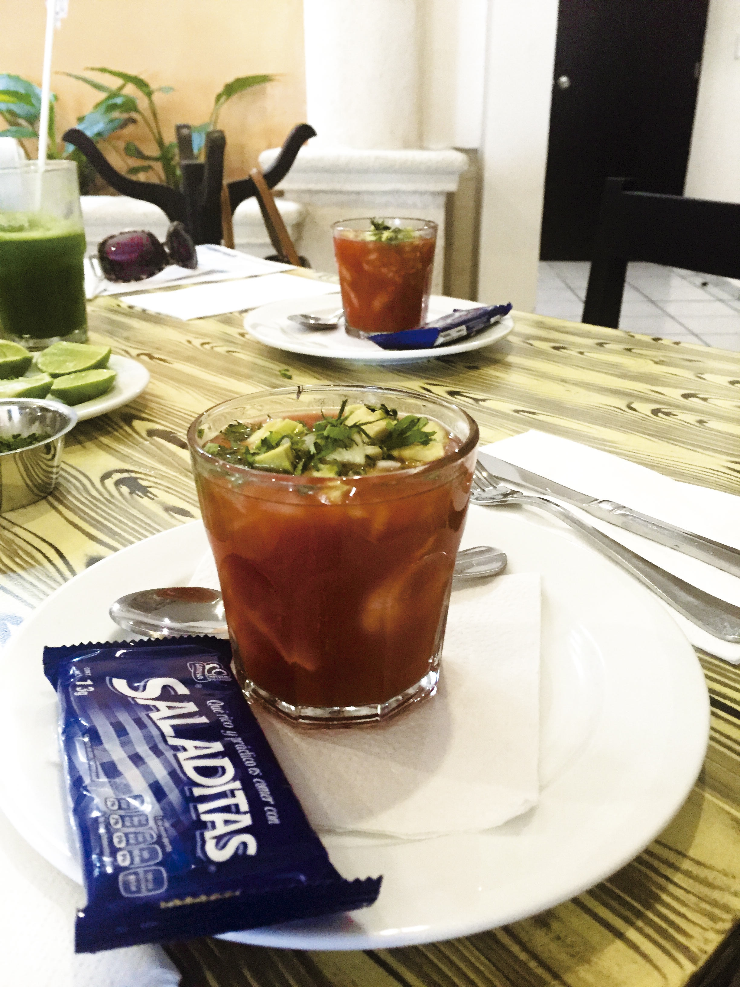 Iniciamos la degustación con un delicioso caldito de pescado servido en vaso, cortés bienvenida que también puede ser de camarón o jaiba, dependiendo de lo que esté listo en el momento. En la mesa están disponibles las salsas de chipotle, chipotle-dulce, mayonesa-chipotle y habanera, entre las que elegimos alguna para acompañar los molotes de plátano rellenos de frijol y queso, muy ricos. Acto seguido recibimos el coctel de camarón, preparado con una ligera y exquisita salsa de tomate y refresco de naranja, y servido con rebanadas de aguacate. Destaca en cada una de estas entradas la frescura de los ingredientes y el punto exacto de consistencia y sabor.