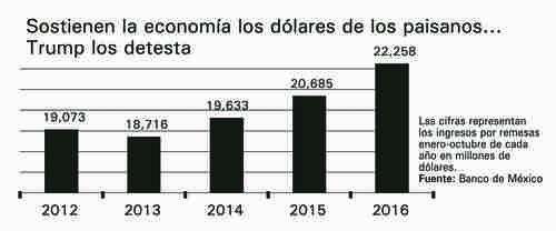 Los paisanos siguen siendo uno de los principales pilares de la economía nacional. Entre enero y octubre enviaron a sus familias 22 mil 258 millones de dólares, 7.6 más que en 2015. Y tal vez este diciembre girarán más dinero, porque es Navidad, pero también por las amenazas de Trump de aplicar un impuesto especial a las remesas.