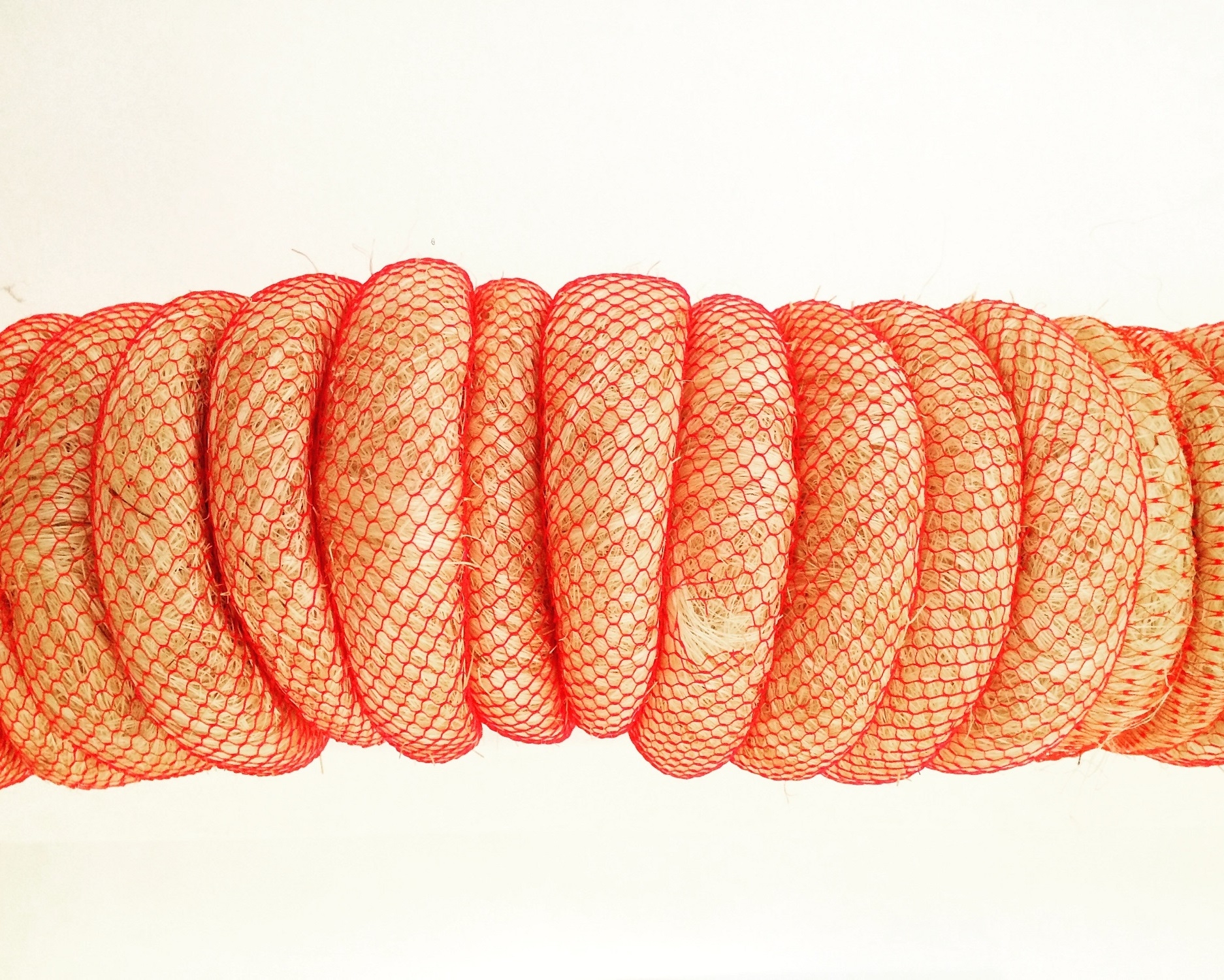 La muestra se bebe en sorbos breves, como lo bueno, con calma. La pequeña sala del recinto se cubre solamente por 11 piezas, y no necesita más. Es sustanciosa, sobria, concreta, bella y delicada. El punto de partida está en su naturaleza misma, pues a diferencia de otro tipo de obra, el textil parece llamarnos al tacto; las superficies tejidas y sus texturas nos invitan a deslizar los dedos por ellas y a conocerlas. Nuestra relación con los textiles siempre ha sido cercana y está asociada con el abrigo primero, después de la piel, un textil es nuestro segundo refugio. Es defensa, un escudo flácido y amable que nos acoge y defiende del mundo; externa y extensa proyección del útero originario.