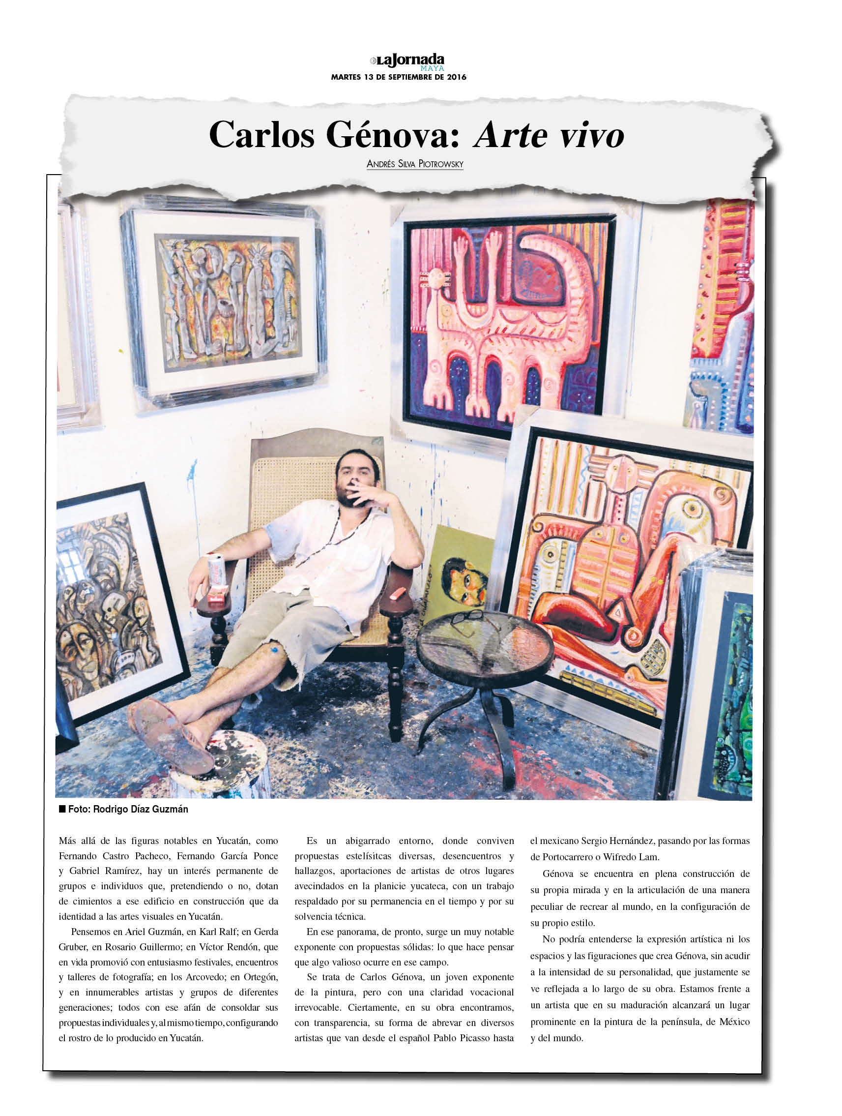 Se trata de Carlos Génova, un joven exponente de la pintura, pero con una claridad vocacional irrevocable. Ciertamente, en su obra encontramos, con transparencia, su forma de abrevar en diversos artistas que van desde el español Pablo Picasso hasta el mexicano Sergio Hernández, pasando por las formas de Portocarrero o Wifredo Lam.
