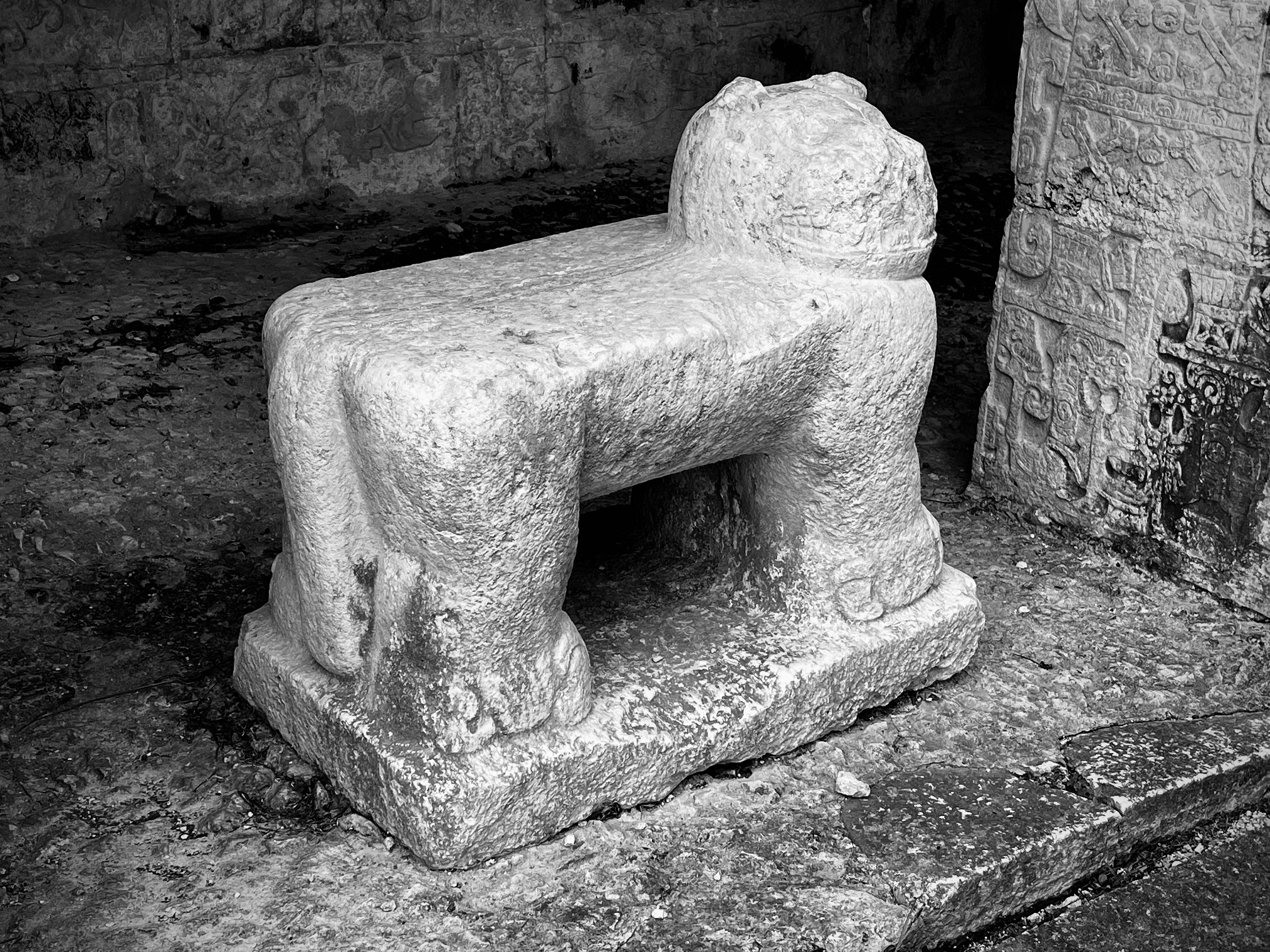 En el ámbito divino se le relacionaba con Tezcatlipoca ya que en los mitos de creación este numen fue el primer Sol, que -al ser desplazado por Quetzalcóatl- se convirtió en jaguar. Entre los antiguos nahuas al jaguar se le conoció también como tepeyollotli, corazón del monte; esta designación describe su habitad, lugares boscosos y madrigueras que asemejan entradas al inframundo. Asimismo, su instinto de acechar a su presa, camuflajeado por su piel, fueron elementos de admiración y temor que hicieron suyas las órdenes guerreras para representarse con estos atributos en pinturas y bajorrelieves en el mundo maya. En estas latitudes, es común encontrarse con los tronos de jaguar, asiento del gobernante, punto en donde confluye el arriba y el bajo, símbolo de poder por excelencia.