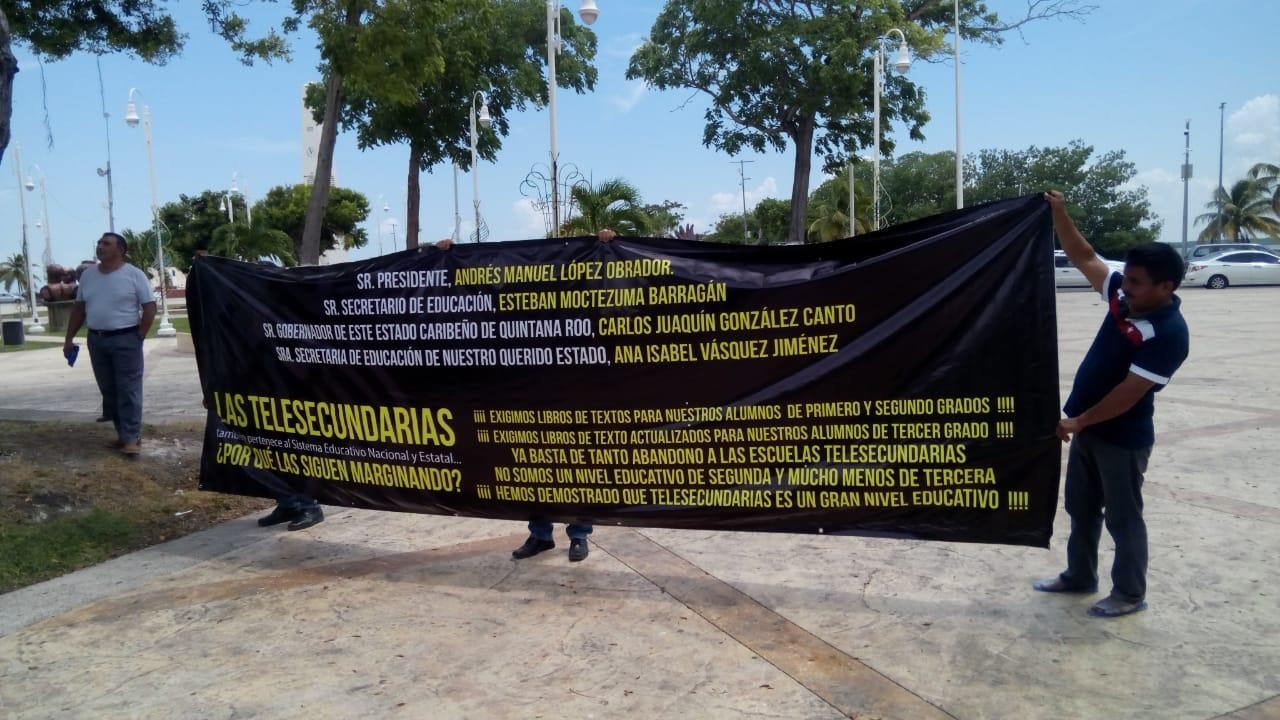 Al menos unos 40 docentes de educación telesecundaria se manifestaron esta tarde frente a Palacio de gobierno en Chetumal. La movilización, la segunda del mes, se realiza en protesta de docentes que aseguran que trabajan con libros que datan de 2006.