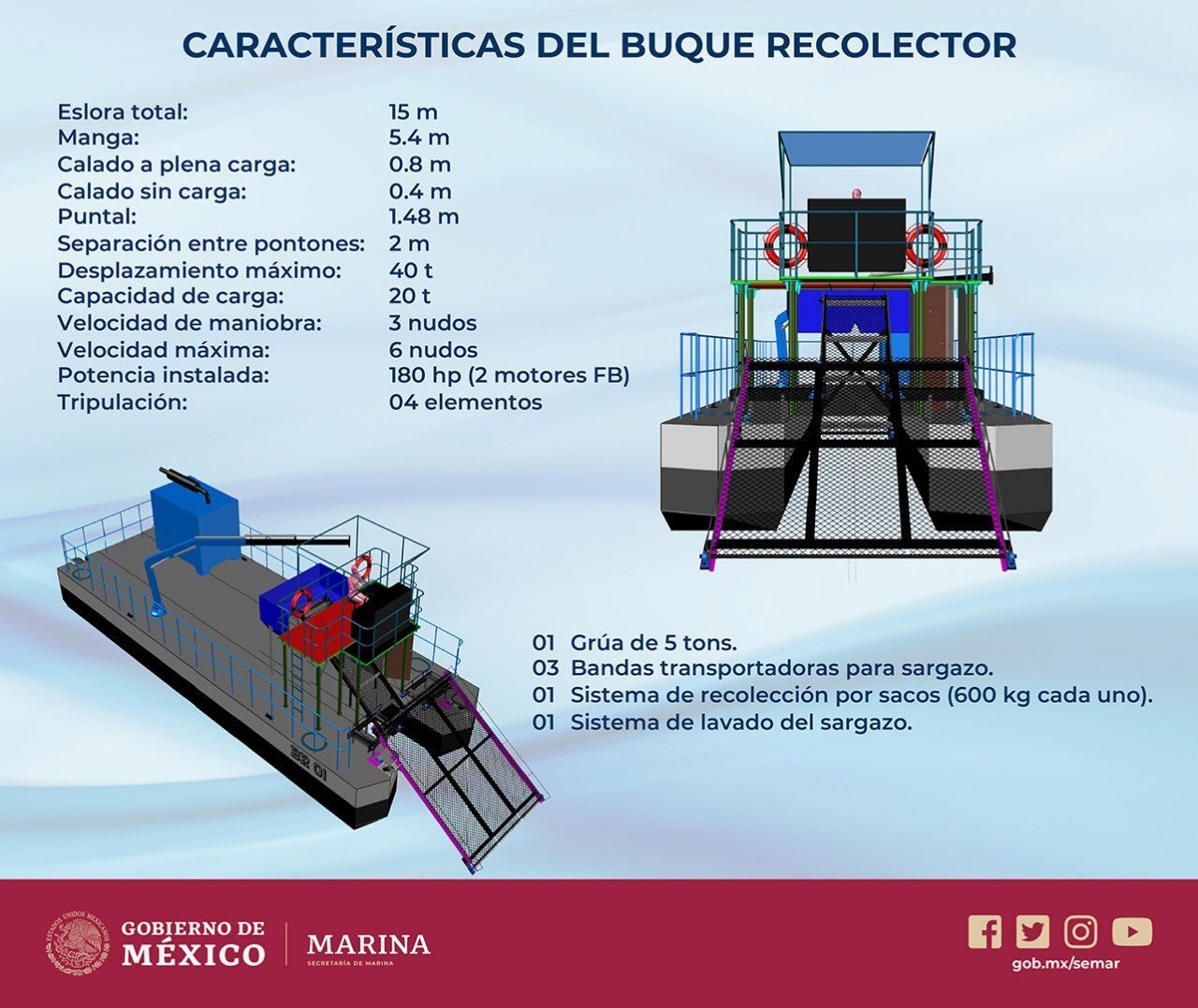 Comentó que cada embarcación tendrá un costo de 7.5 millones de pesos; los buques tendrán capacidad para recolectar 80 toneladas en cuatro recorridos por día y están equipadas con una grúa de 50 toneladas, bandas transportadoras, sistema de recolección por secos y sistema de lavado, que permitirá encostalar el sargazo para su posterior proceso.