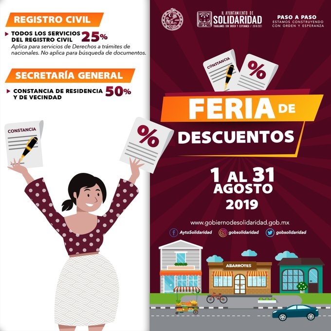 En la Feria de Descuentos 2019, que se llevará a cabo durante el mes de agosto, participan nueve direcciones del Ayuntamiento de Solidaridad: Ingresos, Catastro, Desarrollo Urbano, Fiscalización, Tránsito, Comercio, Protección Civil, Registro Civil y Secretaria General, las que ofrecerán descuentos en recargos, regularización y nuevos trámites, que irán desde un 15 hasta un 50 por ciento, dio a conocer Alfredo Paz Cetina, secretario general del ayuntamiento, quien acudió en representación de la alcaldesa Laura Beristain Navarrete.
