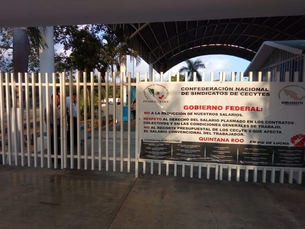 El personal docente y administrativo de base de los nueve planteles del Colegio de Estudios Científicos y Tecnológicos (Cecyte) en Quintana Roo se unieron al paro de labores que se realiza en todo el país y que se mantendrá de manera indefinida hasta que las autoridades educativas a nivel central resuelvan las demandas planteadas.
