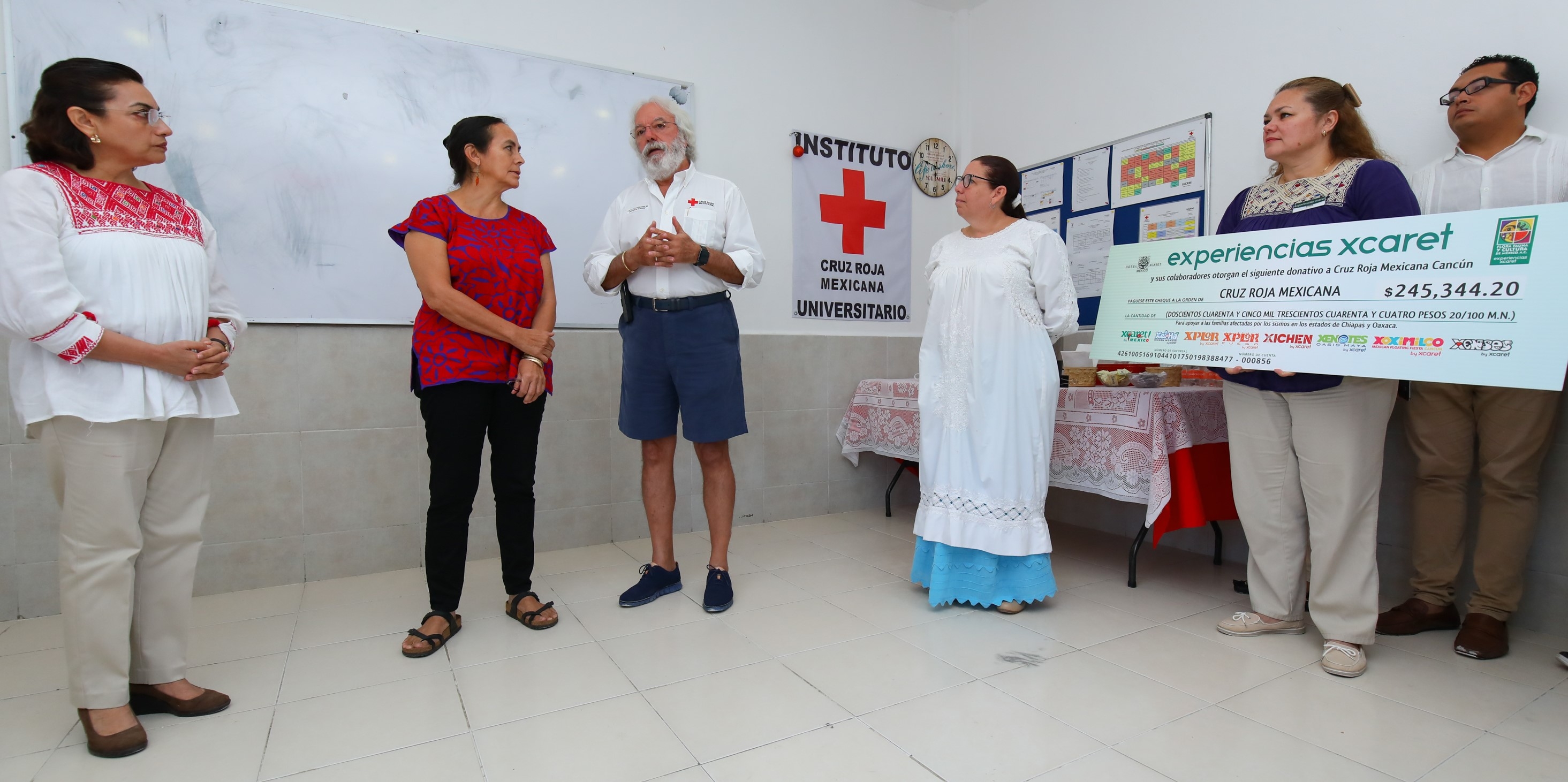 Colaboradores de Experiencias Xcaret y Flora, Fauna y Cultura de México organizaron la colecta en la que recaudaron 122 mil 672 pesos. Experiencias Xcaret aportó un monto igual al recaudado, lo que sumó la bolsa de 245 mil 344 pesos, que se entregó a la delegación Cancún de la Cruz Roja Mexicana.