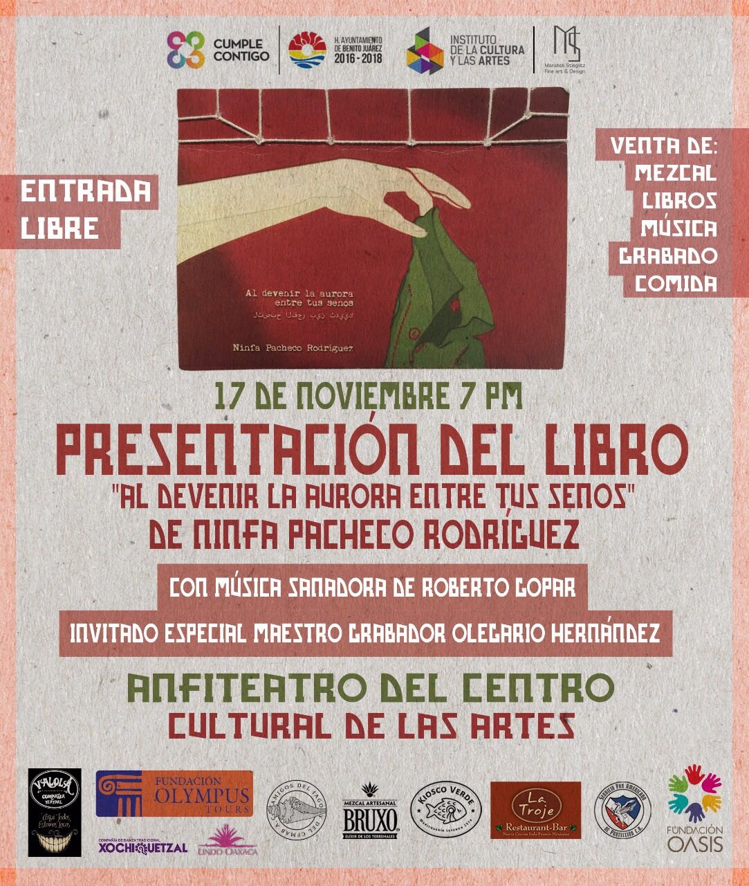 Mencionó que en la presentación, a la poeta Ninfa Pacheco, una mujer oaxaqueña dedicada a las terapias y a la poesía, la acompañará la música sanadora de Roberto Gopar, y como invitado especial el maestro grabador Olegario Hernández, una combinación de poesía y música que siempre han ido muy de la mano;la presentación será en el anfiteatro del Centro Cultural de las Artes, el próximo 17 de noviembre, a las 19 horas.