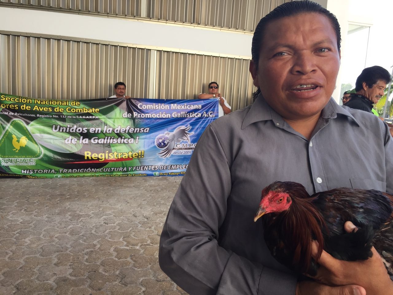 Integrantes de la Sección Nacional de Criadores de Aves de Combate y la Comisión Mexicana de Promoción Gallística A.C., encabezados por Efraín Rábago Echegoyen, se manifestaron en el Congreso de Quintana Roo para pedir un diálogo con la diputada panista Eugenia Solís, quien hace unas semanas presentó una propuesta ante la 15 Legislatura para que se prohíban las corridas de toros y las peleas de gallos en el estado.