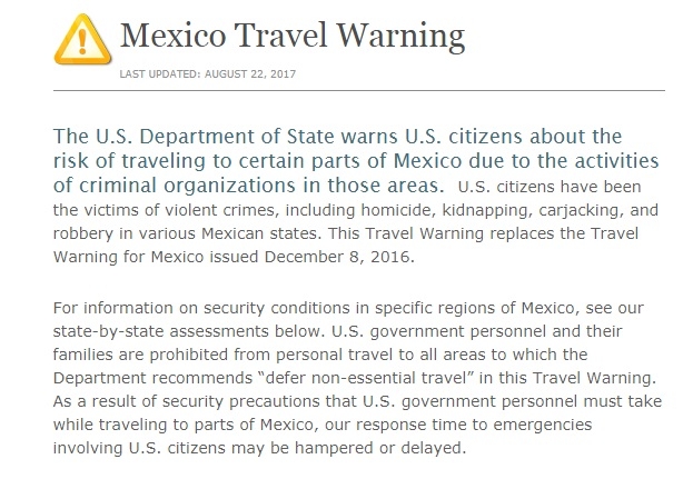 También advierte que el personal del gobierno estadunidense tienen prohibido viajar al estado de Guerrero y en Veracruz sólo deben permanecer en las áreas turísticas. No tienen permitido utilizar transporte público.