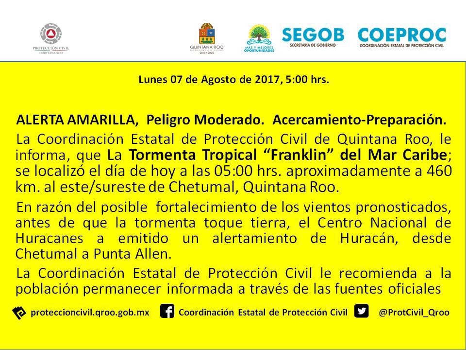 Antes de las 7 horas de este lunes, el Centro Nacional de Huracanes, declaró "Alerta Amarilla" (peligro moderado- acercamiento preparación), desde Chetumal hasta Punta Allen, por la cercanía de la Tormenta Tropical [i]Franklin[/i] a costas de Quintana Roo.