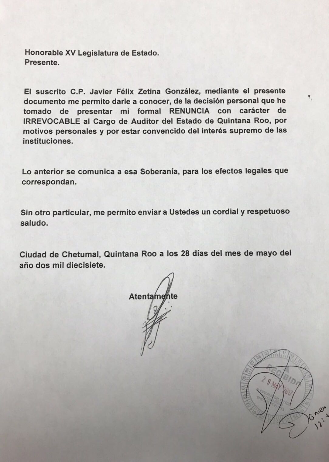 En un escrito con fecha del pasado domingo 28 de mayo, Javier Zetina -quien debía incorporarse este lunes a sus funciones de auditor superior al haber concluido el plazo de 60 días de licencia aprobados el 31 de marzo- presentó un oficio ante Oficialía de partes del Congreso estatal donde expresa la “decisión personal que he tomado para presentar mi renuncia con carácter de irrevocable al cargo de Auditor Superior del Estado, por motivos personales y por estar convencido del interés supremo de las instituciones”.