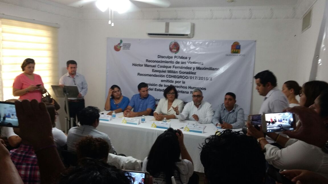 La disculpa pública programada por la mañana de ayer a Héctor Manuel Cacique Fernández y Maximiliano Ezequiel Millán González, víctimas de detención arbitraria y tortura en marzo de 2013, concluyó en una serie de acusaciones contra la Fiscalía de Justicia, que no ha ejecutado acción penal contra 43 funcionarios que participaron en este hecho. Con la ausencia del fiscal general, Miguel Ángel Pech Cen, las víctimas rechazaron dicha disculpa, derivada de una recomendación de la Comisión de los Derechos Humanos del estado (CDHEQROO).