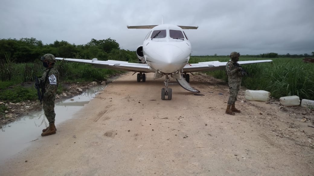 Por lo anterior, la Décimo Primera Zona Naval desplegó elementos de Infantería de Marina, quienes en coadyuvancia con personal de la Guardia Nacional del Municipio de Othón P. Blanco, lograron el aseguramiento de una aeronave tipo Jet Hawker color blanca, sin matrícula, la cual se encontraba abandonada.