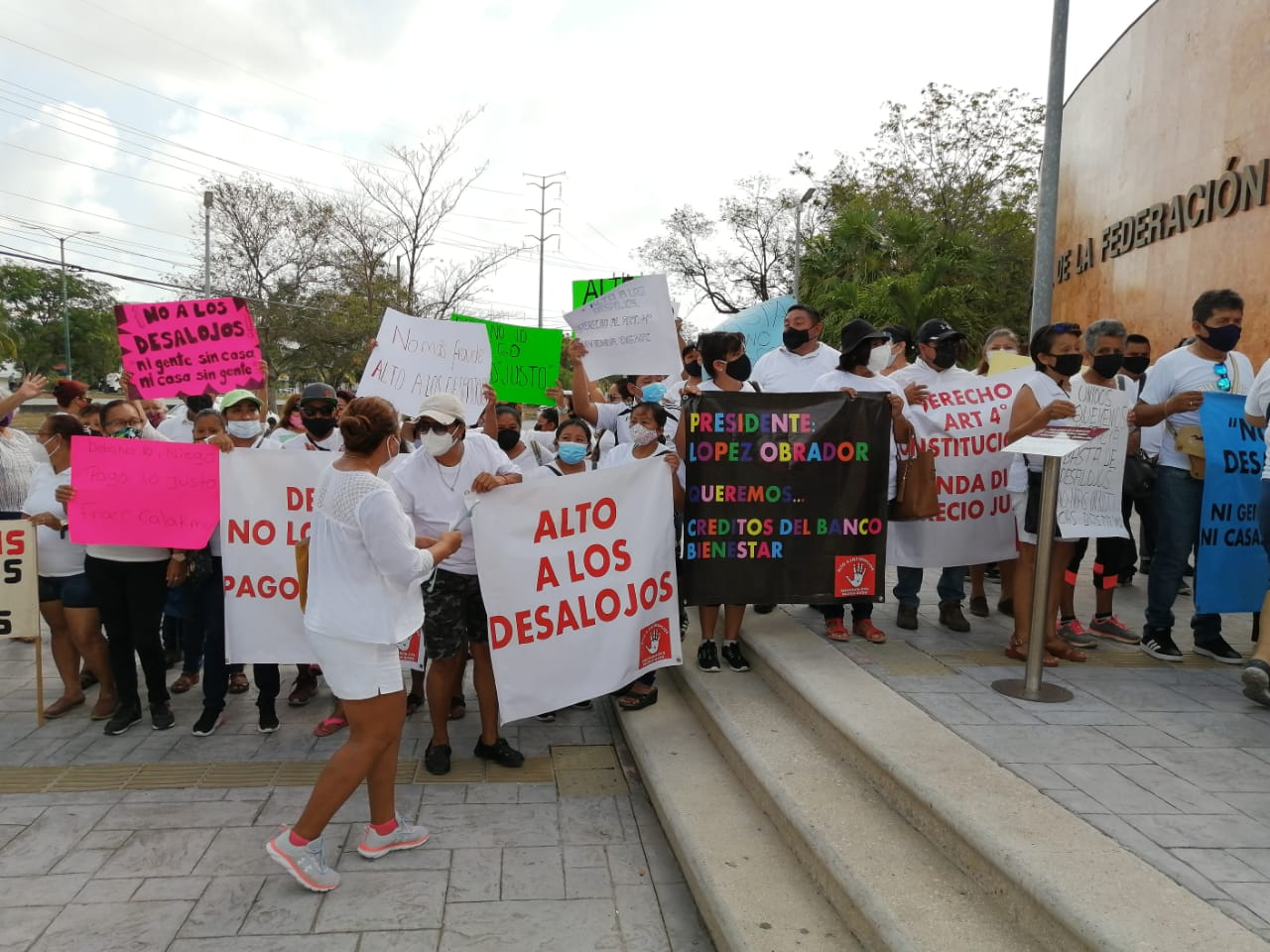 Un grupo de más de 200 personas acudió con mantas y cartulinas a protestar afuera de los tribunales del Poder Judicial de la Federación en Cancún, para exigir un alto a los desalojos derivados de créditos de hipotecarias desaparecidas, por estar estos procesos viciados.
