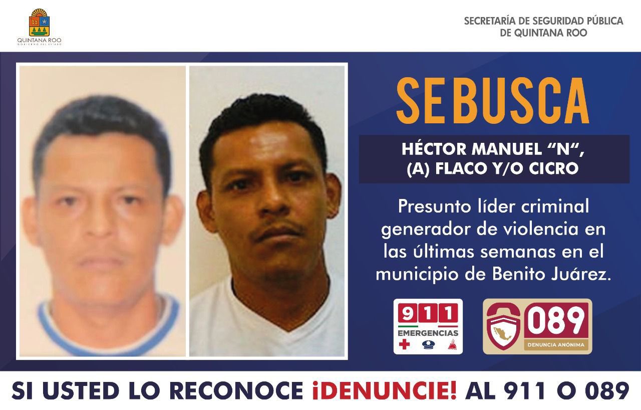 “Héctor Manuel N. es un presunto líder criminal responsable de la violencia en el municipio de Benito Juárez durante las últimas semanas; si lo reconoce, ¡Denúncielo! Llame a los números 911 o 089, su participación es muy importante para combatir a la delincuencia”, publicó en sus redes sociales el encargado de despacho de la Secretaría de Seguridad Pública de Quintana Roo, Lucio Hernández Gutiérrez.