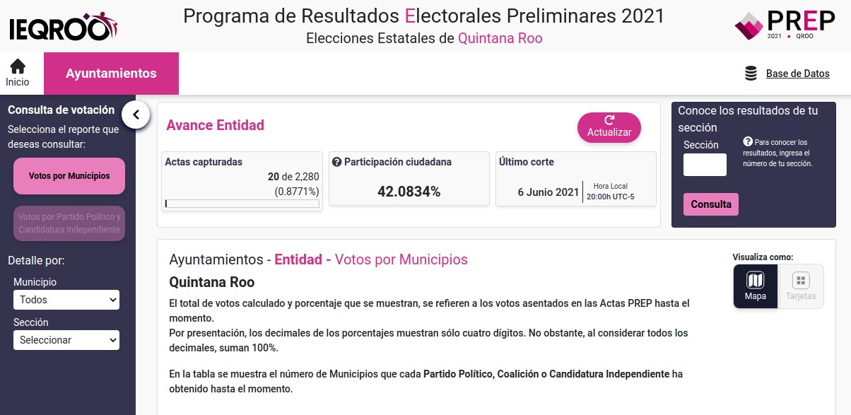 Tal como estaba previsto, a las 20 horas arrancó la publicación de los resultados del Programa de Resultados Electorales Preliminares 2021 (PREP), con 20 actas capturadas, correspondientes a 0.8 por ciento del total del estado de Quintana Roo.