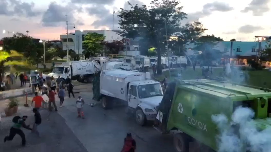 Una manifestación de trabajadores de la concesionaria de recolección de basura Intelligencia México derivó en un enfrentamiento con la policía la noche de este lunes, en el centro de Cancún.