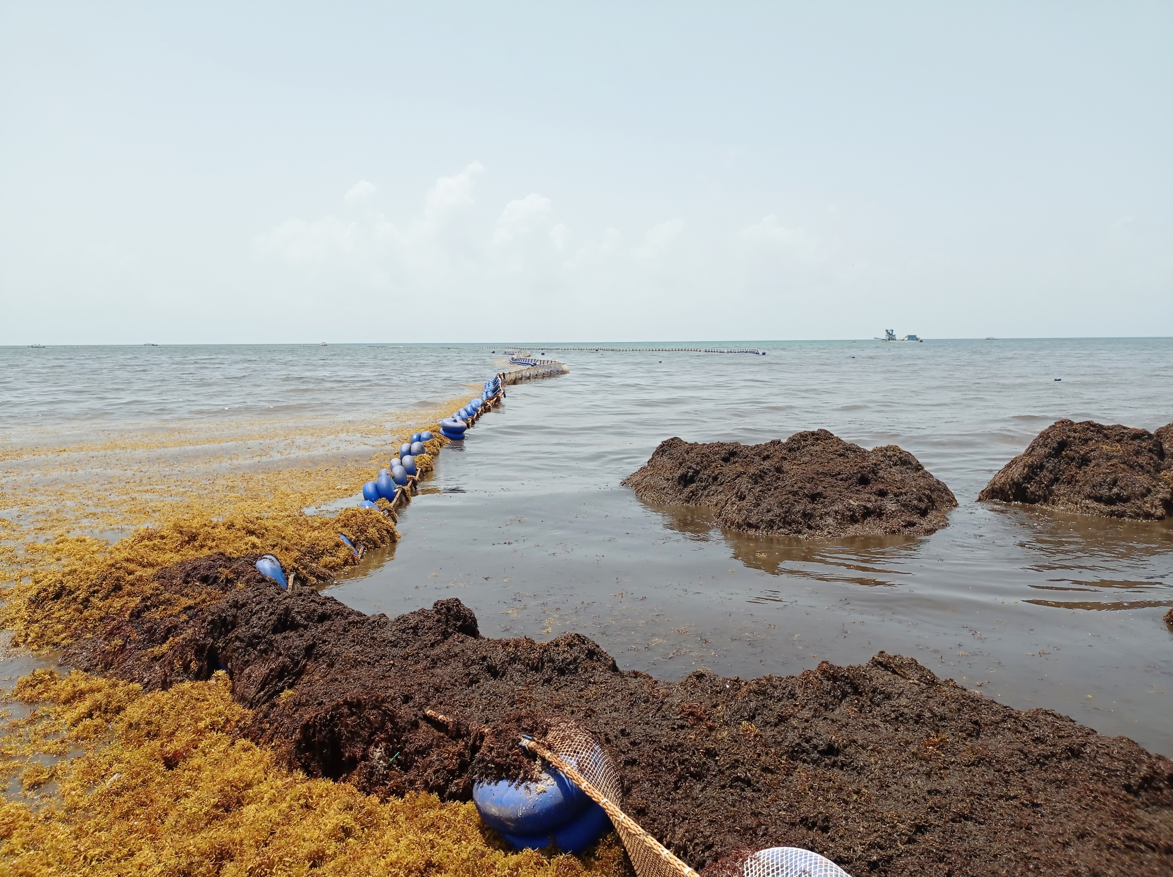 Entrar a la playa es prácticamente imposible por la cantidad de sargazo, que se extiende varios metros mar adentro. Aquí también está instalada la barrera que debería contener el alga, pese a ella, el recale masivo en la costa continúa. En la zona, además, opera un buque sargacero de la Semar, el cual puede verse desde la playa cómo intercepta el alga.