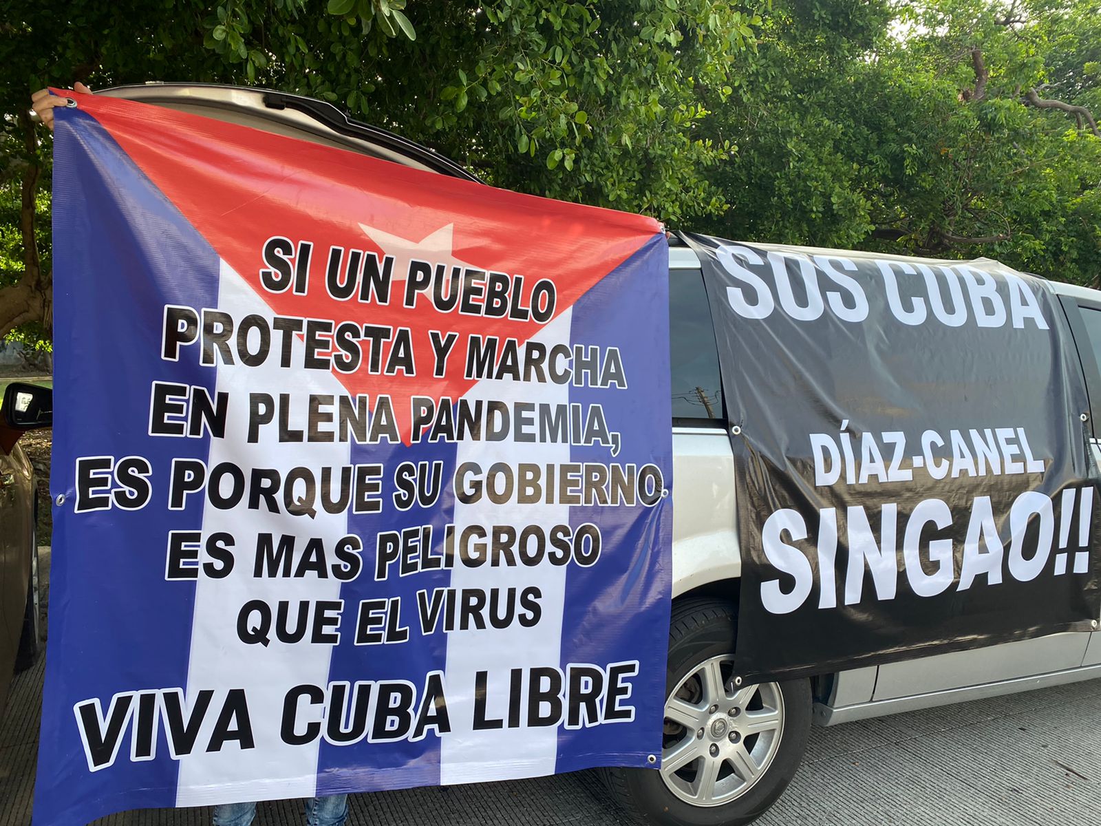 Los manifestantes portaban banderas y pancartas que expresaban “si un pueblo protesta y marcha en plena pandemia, es porque su gobierno es más peligroso que el virus, viva Cuba libre”.