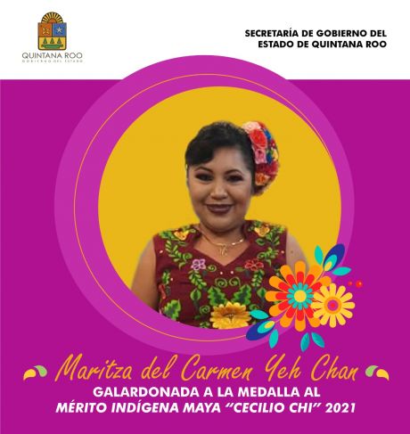 Originaria de Uh May, localidad del municipio de Felipe Carrillo Puerto, Maritza Yeh Chan, conocida como la doncella maya, será la primera mujer en recibir la medalla al Mérito Indígena Maya “Cecilio Chi” 2021, que se entregará este 30 de julio en sesión solemne del Congreso de Quintana Roo.