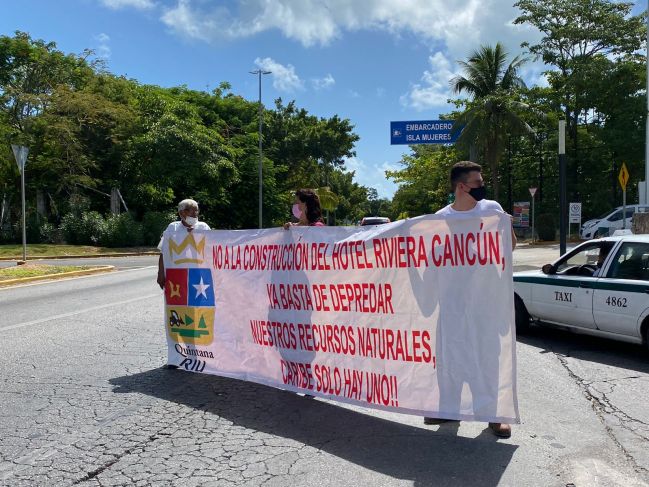 Los activistas protestaron con dos mantas que tenían las leyendas “no a la construcción del hotel Riviera Cancún en Nizuc, inversionistas responsables sí, depredadores no” y “ya basta de depredar nuestros recursos naturales, Caribe sólo hay uno”, en el kilómetro cero de la zona hotelera, sin bloquear el tránsito del lugar y ocupando solamente un carril.
