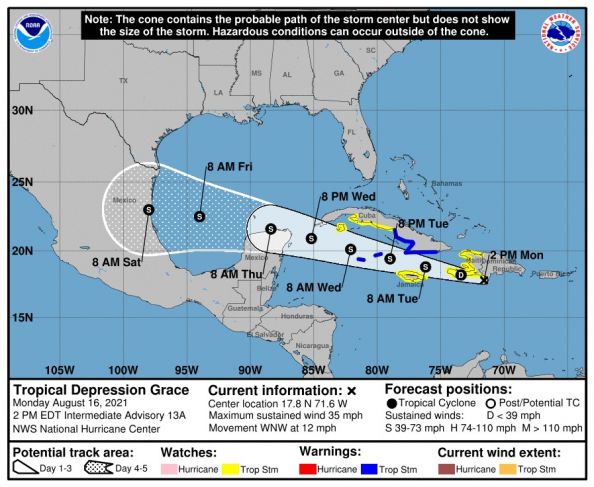 "'Grace' continúa como depresión tropical y se espera que ingrese a la Península de Yucatán como tormenta tropical o huracán durante la noche del miércoles o primeras horas del jueves", dio a conocer la dependencia.
