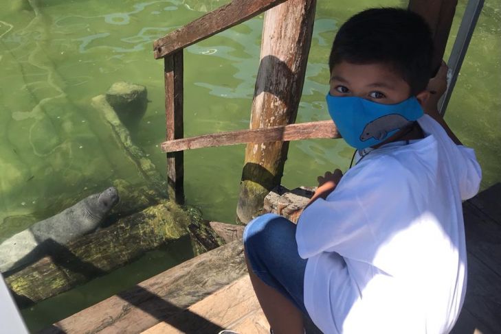 A nombre del gobernador Carlos Joaquín, el secretario de Ecología y Medio Ambiente (SEMA), Efraín Villanueva Arcos, felicitó al ganador del concurso “Ponle nombre al bebé manatí”, al niño José Luis González Poot de 7 años, al develar la placa conmemorativa que indica el nombre de la pequeña cría: Pompeyo.