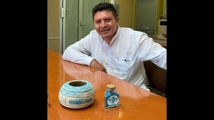 Luis May Ku se hizo acreedor del galardón "Palmas de Oro" en la categoría de mejor escultor, ceramista maya mexicano 2021 y por haber recreado el azul maya que ha obtenido del ch'oj, una planta nativa.