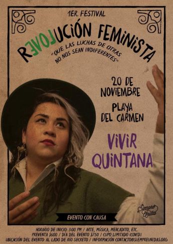El colectivo feminista Siempre Unidas convoca al primer festival Revolución Feminista, que se realizará en Playa del Carmen el próximo sábado 20 de noviembre en el marco del Día Internacional de la Eliminación de la Violencia contras las Mujeres. El festival contará con la presencia de Vivir Quintana, autora e intérprete del himno feminista ‘Vivir sin miedo’. El colectivo demanda cesar la violencia feminicida, cuyas cifras colocan a Quintana Roo en el primer sitio a nivel nacional por cada 100 mil habitantes, con 19 feminicidios reconocidos, pero 25 documentados por las activistas.