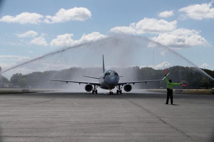 El gobernador Carlos Joaquín dio la bienvenida a los pasajeros de esta nueva ruta y presenció el tradicional bautizo de la aeronave, un Embraer 175.