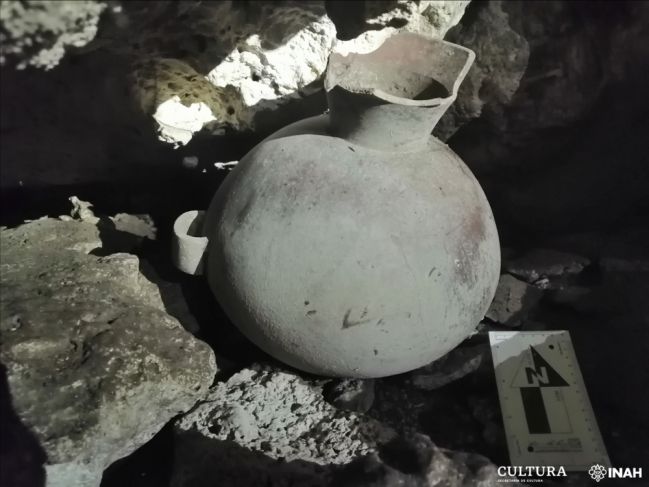 “El cajete fue depositado boca abajo y cubierto con piedras, por lo cual es claro que se trata de una ofrenda, mientras que las vasijas fueron usadas para la recolección ritual del agua prístina que bajaba de las estalactitas”, explicó el especialista.