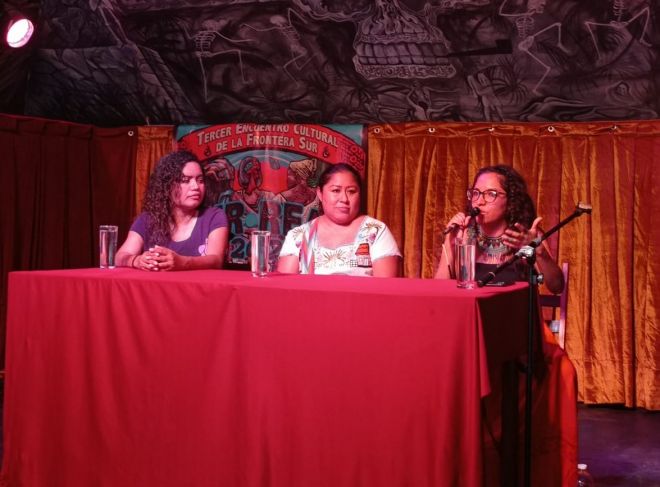 El sábado los presentes en el Galeón Pirata fueron partícipes del panel Feminismos Comunitarios en la Frontera Sur de México, donde Rosario Ruiz, periodista, y las activistas Wilma Esquivel y Shanti Ascencio dialogaron sobre la importancia de visibilizar a las mujeres que desde sus distintos roles abonan al feminismo.