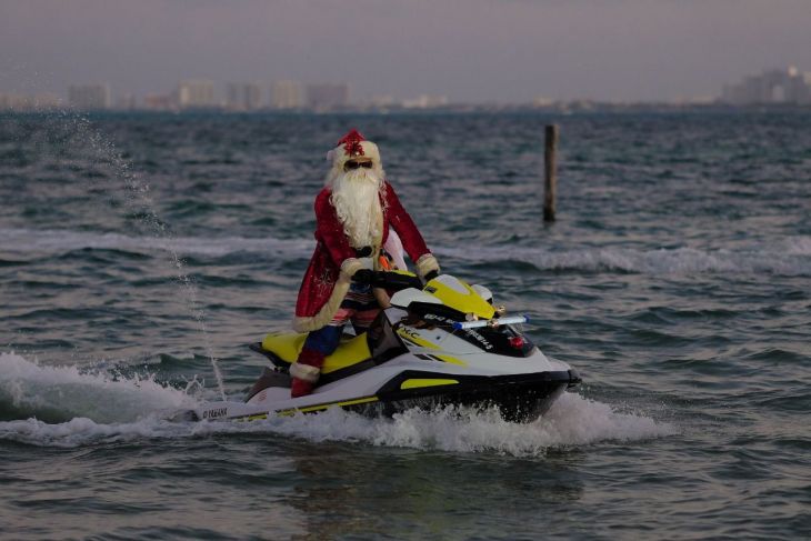 A bordo de motos acuáticas, llegó Santa en traje de baño y snorkel junto a sus duendes a Playa Del Niño en la emblemática subdelegación Puerto Juárez, donde fue recibido por la presidente municipal Mara Lezama, quien indicó que la finalidad de esta celebración es construir tradiciones que gocen las familias y que abonen a la recomposición del tejido social.