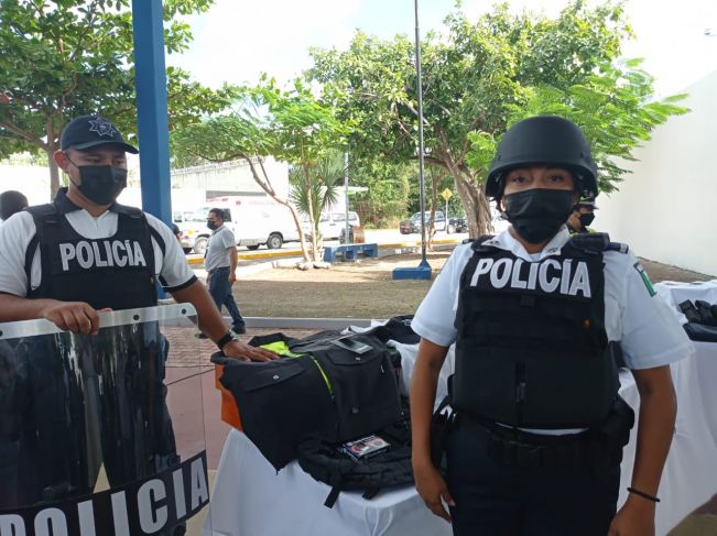 La tarde de este martes la policía municipal de Solidaridad recibió uniformes, equipamiento balístico y equipos de radio comunicación con una inversión que supera los 79 millones de pesos para fortalecer la labor y estrategia de seguridad. Resalta que por primera vez se entregan chalecos especialmente diseñados para las elementos femeninas.