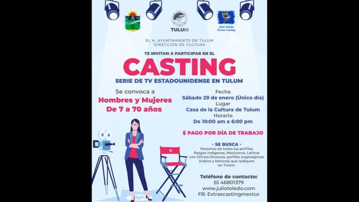 Flor Ramos Torruco, directora de cultura municipal, dio a conocer que los organizadores, a través de las autoridades locales, están invitando al público en general a participar en una serie de televisión cuyo casting se realizará el día 29 de enero, de 10 de la mañana a 6 de la tarde en las instalaciones de la Casa de la Cultura, ubicada en la calle Neptuno con avenida Osiris.