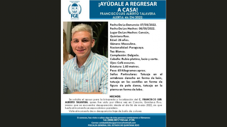La madre del joven Francisco Luis Alberto Talavera, de nacionalidad paraguaya y desaparecido desde el pasado 6 de marzo de 2022 en Cancún, viajará este sábado a Quintana Roo desde Asunción, en el país sudamericano, para tratar de localizar a su hijo.
