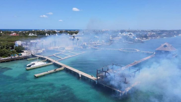 Un incendio en el delfinario Dolphin Discovery de Isla Mujeres consumió cuatro palapas; no hubo personas lesionadas, sólo algunas asustadas por la magnitud del fuego que fueron evacuadas hacia los muelles de las instalaciones.