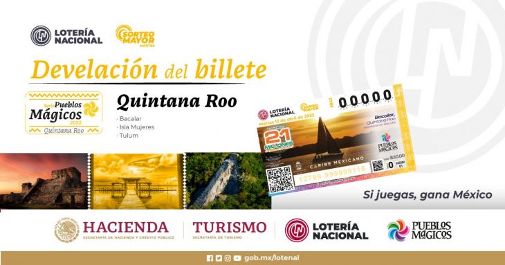Bacalar, Isla Mujeres y Tulum son los tres pueblos mágicos del estado que ofrecen grandes atractivos junto al azul turquesa del mar Caribe, así como de una laguna bacalarense y que se estarán promocionando a través de este billete de la lotería.