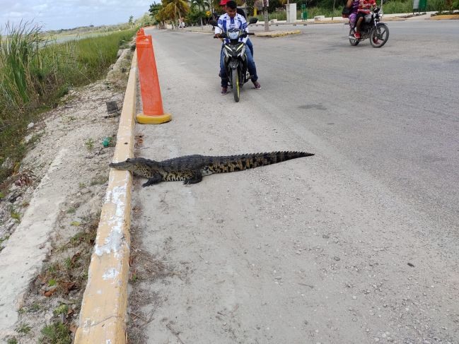 Habitantes de la zona captaron cómo estos reptiles cruzaban sobre el pavimento hacia el área comercial cercana a la zona arqueológica y luego de regreso a la laguna, donde el nivel del agua está casi a la par de la vialidad, de forma que ante la carencia de la infraestructura que obstruya su paso los animales salen libremente.