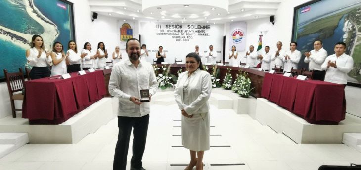 Como parte de la celebración del 52 aniversario de la fundación de Cancún se llevó a cabo la Tercera Sesión Solemne del Ayuntamiento de Benito Juárez, en la que se hizo entrega a Roberto Díaz Abraham de la Medalla al Mérito Ciudadano “Sigfrido Paz Paredes”, máximo reconocimiento a un benitojuarense con una notable trayectoria en favor del municipio.