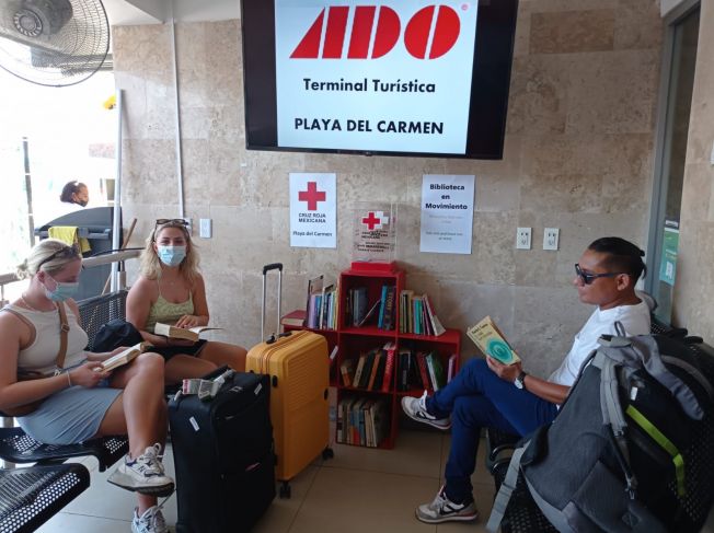 La terminal de ADO de la Quinta avenida cuenta ahora con una Biblioteca en Movimiento, una iniciativa de la Cruz Rojo que permite que los viajeros tomen un libro y dejen otro, además de que pueden aportar a la alcancía de la benemérita institución.
