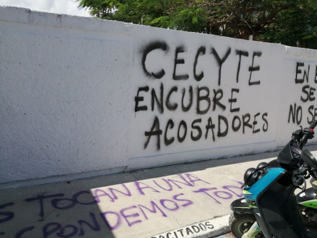 Alumnas e integrantes del Colectivo Feminista de Tulum realizaron la tarde de este martes una manifestación a las afueras del Colegio de Estudios Científicos y Tecnológicos (Cecyte), plantel Tulum, por el caso de estudiantes que denunciaron haber sufrido acoso por parte de maestros.