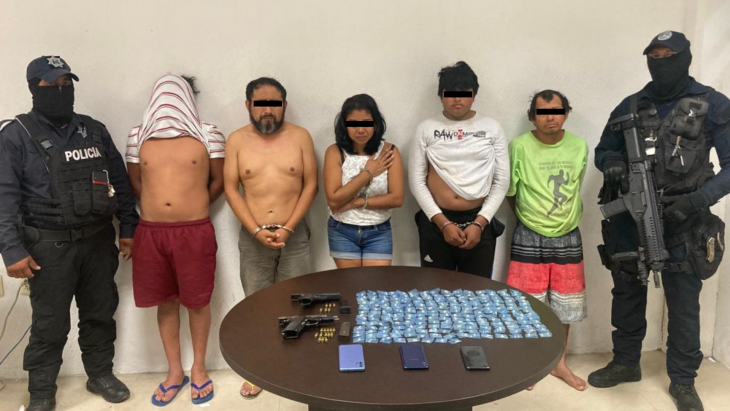 Como parte del operativo permanente Fortalecimiento de Acciones y Protección Ciudadana para la Construcción de la Paz, personal de la Dirección de Seguridad Pública y Tránsito de Tulum realizó la detención de cinco personas (cuatro hombres y una mujer) en posesión de dos armas de fuego, 19 cartuchos útiles y narcóticos durante un rondín de vigilancia en la colonia irregular 2 de Octubre.